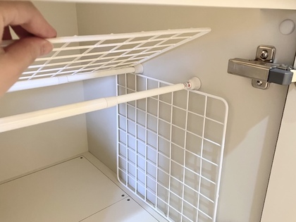 そこで、つっぱり棒とワイヤーネットを合わせて使用し、デッドスペースに収納を作りました。
