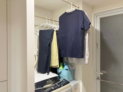 つっぱり棒を張って洋服を掛けて収納できるようにしました。