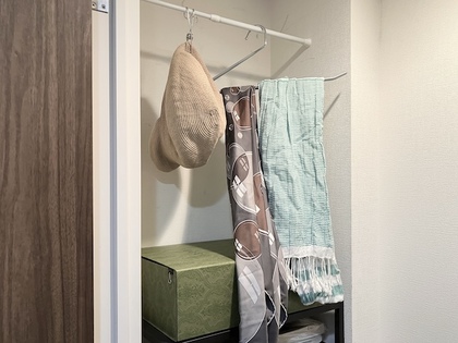 玄関脇の納戸にも同じようにつっぱり棒を張って出かける時につけるスカーフや帽子を収納しました。