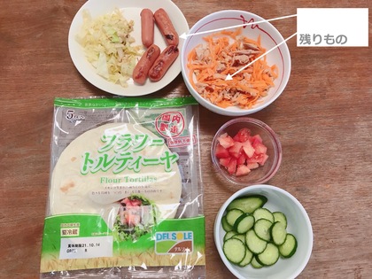 朝食の残りのウインナーや野菜をまきまきしていただきます!